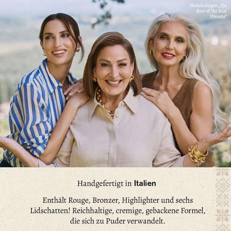 Von goldenen Weinbergen bis hin zu romantischen Sonnenuntergängen – jeder Farbton wurde entworfen, um das Herz der Toskana einzufangen.Es ist mehr als nur Make-up — es ist Ihr Pass zu müheloser Schönheit.